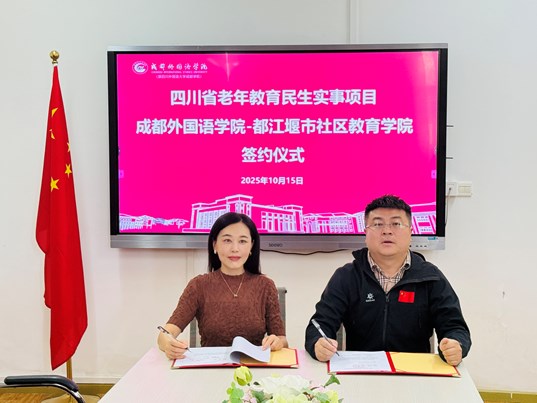 上午 11 点,双方首先在会议室展开会议。会上,熊旭院长详细介绍了成都外国语学院在老年教育领域的规划与筹备情况。周蓉校长对学院的前期工作予以肯定,同时围绕项目的目标、实施路径等提出了诸多具有指导性的意见,强调要以满足老年人学习需求、提升老年人生活品质为核心,扎实推进项目建设。随后,双方进行了签约仪式,这标志着成都外国语学院与都江堰市在老年教育领域的合作正式迈入新的阶段,为后续项目的深入开展奠定了坚实基础。